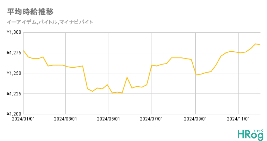 平均時給は4月から7月にかけて下がる傾向がうかがえます。また、1月から12月にかけては5円増加し、最新のデータでは1,285円となりました。