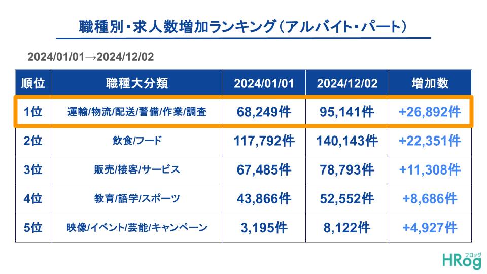 職種別に求人件数の増加数を見てみると、「運輸/物流/配送/警備/作業/調査」が+26,892件で最多となりました。次いで「飲食/フード」が+22,351件、「販売/接客/サービス」が+11,308件、「教育/語学/スポーツ」が+8,686件、「映像/イベント/芸能/キャンペーン」が+4,927件と続いています。