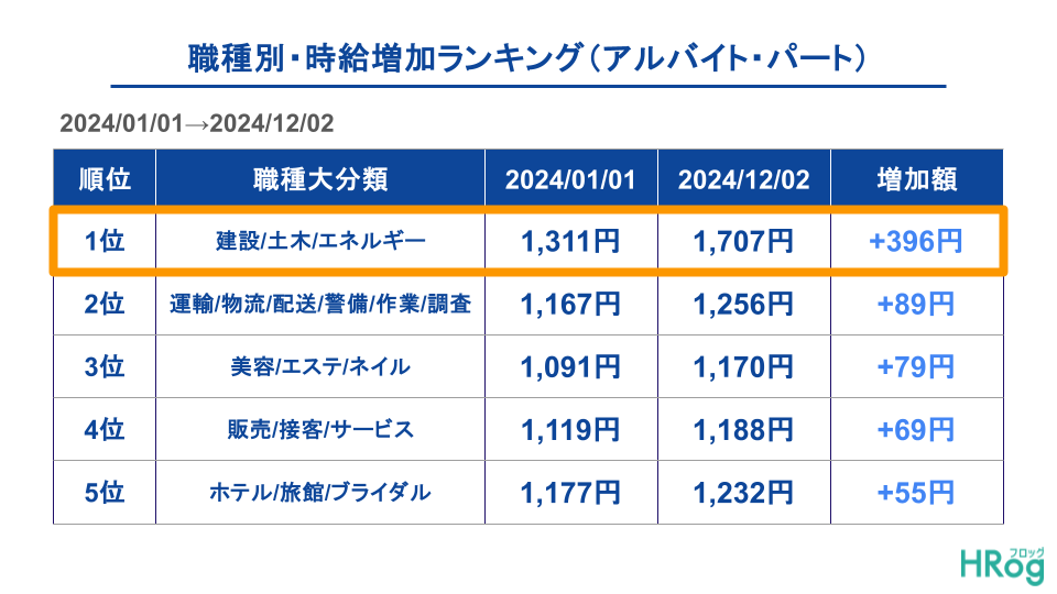 続いて職種別の時給を見てみると、「建設/土木/エネルギー」が+396円で1位にランクイン。次に「運輸/物流/配送/警備/作業/調査」が+89円、「美容/エステ/ネイル」が+79円、「販売/接客/サービス」が+69円、「ホテル/旅館/ブライダル」が+55円と続きました。