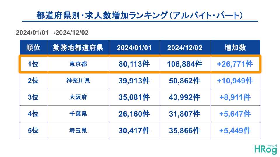 都道府県別に求人件数を見てみると、「東京都」が+26,771件で最多となっています。続いて「神奈川県」が+10,949件、「大阪府」が+8,911件、「千葉県」が+5,647件、「埼玉県」が+5,449件となりました。