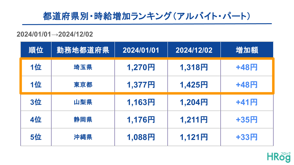 さらに都道府県別の時給を見てみると、「埼玉県」と「東京都」が+48円で1位となっています。次いで「山梨県」が+41円、「静岡県」が+35円、「沖縄県」が+33円と続きました。