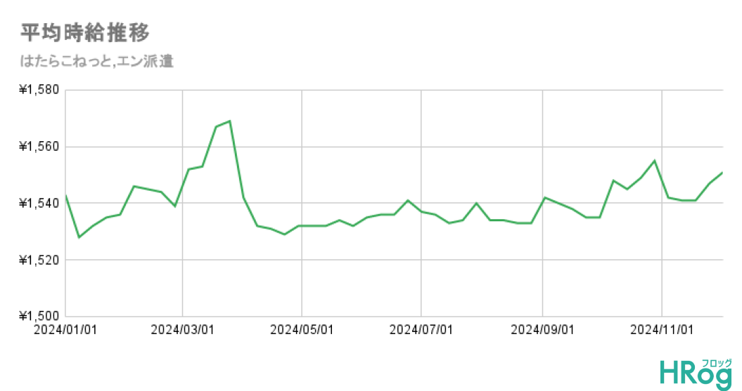 平均時給は4月において大幅に上昇しました。また、1月から12月にかけては8円増加し、最新のデータでは1,551円となりました。