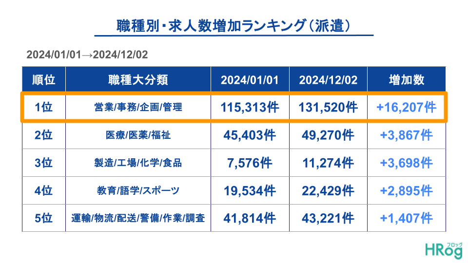 職種別に求人件数の増加数を見てみると、「営業/事務/企画/管理」が+16,207件で最多となりました。次いで「医療/医薬/福祉」が+3,867件、「製造/工場/化学/食品」が+3,698件、「教育/語学/スポーツ」が+2,895件、「運輸/物流/配送/警備/作業/調査」が+1,407件と続いています。