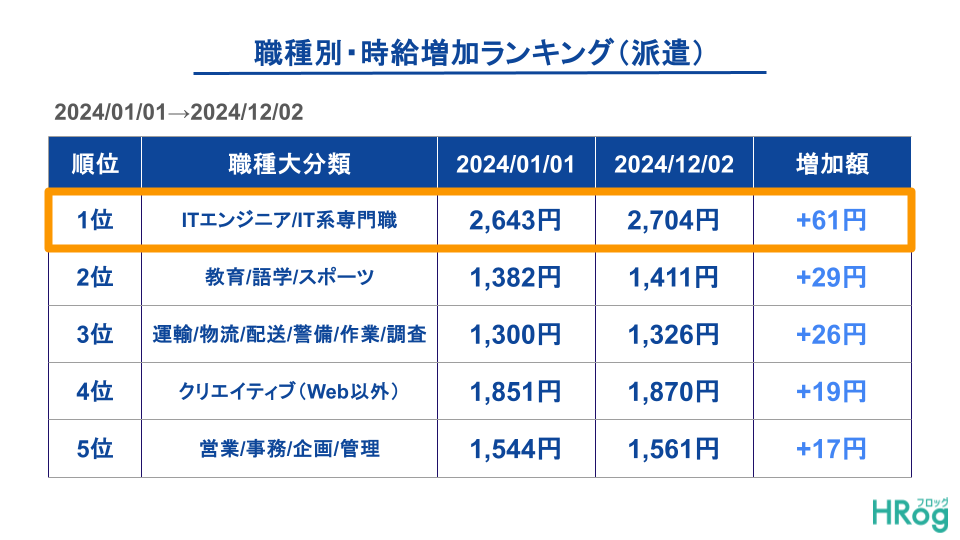 続いて職種別の時給を見てみると、「ITエンジニア/IT系専門職」が+61円で1位にランクイン。次に「教育/語学/スポーツ」が+29円、「運輸/物流/配送/警備/作業/調査」が+26円、「クリエイティブ(Web以外)」が+19円、「営業/事務/企画/管理」が+17円と続きました。