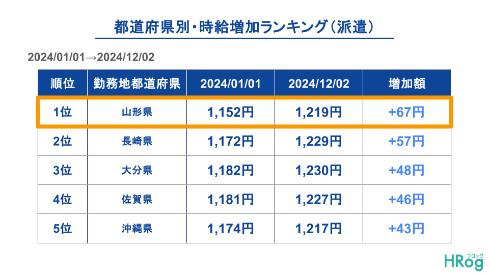 さらに都道府県別の時給を見てみると、「山形県」が+67円で1位となっています。次いで「長崎県」が+57円、「大分県」が+48円、「佐賀県」が+46円、「沖縄県」が+43円と続きました。