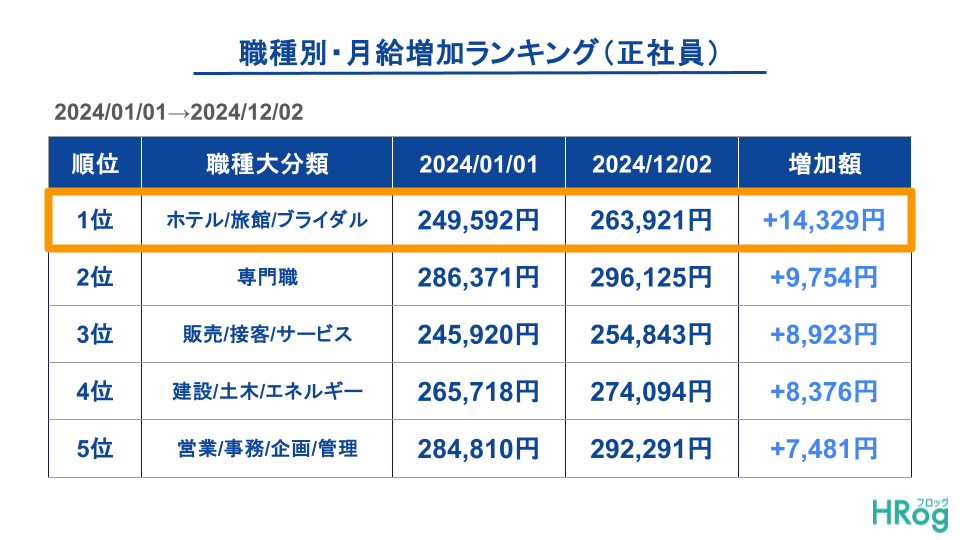 続いて職種別の月給を見てみると、「ホテル/旅館/ブライダル」が+14,329円で1位にランクイン。次に「専門職」が+9,754円、「販売/接客/サービス」が+8,923円、「建設/土木/エネルギー」が+8,376円、「営業/事務/企画/管理」が+7,481円と続きました。