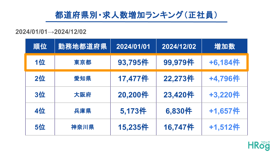 都道府県別に求人件数を見てみると、「東京都」が+6,184件で最多となっています。続いて「愛知県」が+4,796件、「大阪府」が+3,220件、「兵庫県」が+1,657件、「神奈川県」が+1,512件となりました。
