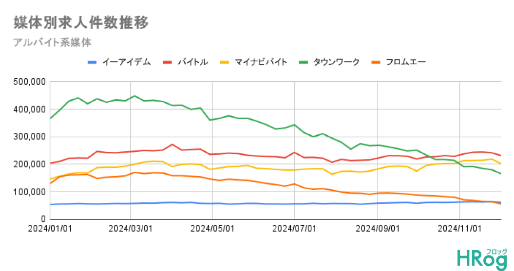 続いて、アルバイト・パート系で主要な5媒体の求人数を媒体別に見ていきます。正社員同様に、Indeed PLUSの始まったタウンワークとフロムエーに直接掲載された求人が減少しました。