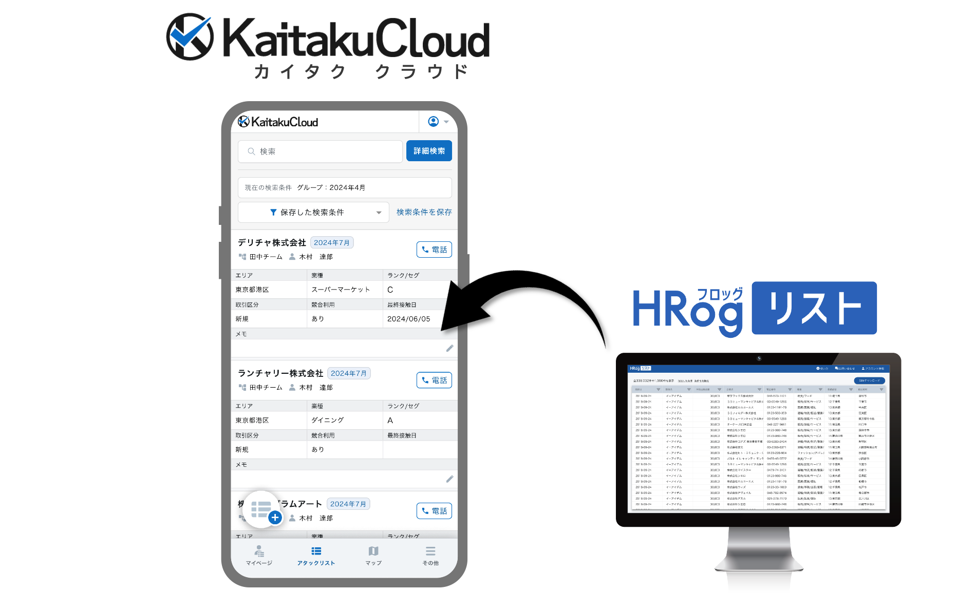 HRogリストの求人出稿データをKaitakuCloud(カイタク クラウド)に取り込むことで、企業の採用ニーズを把握し、効率的な営業活動を実現できます。