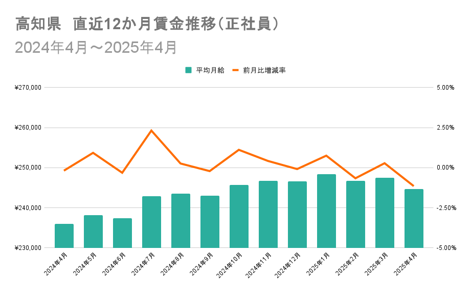 1位の沖縄県と47位の高知県における直近12か月の賃金推移を比較すると、沖縄県では2024年7月から平均月給が上昇傾向に。高知県では2024年6月から同年7月にかけて、特定の製造メーカーが高月給求人を複数出稿し平均月給が増加してからは、横ばいでの推移を見せています。
