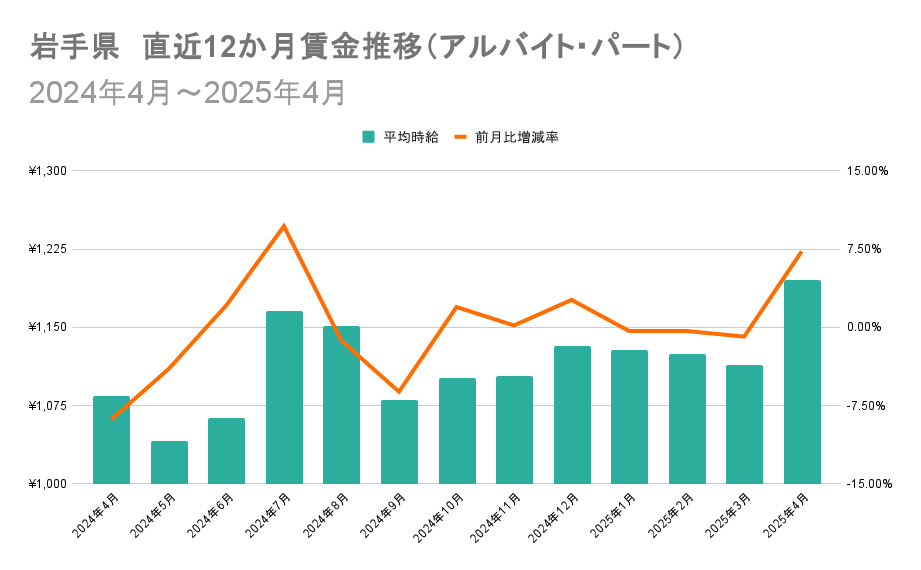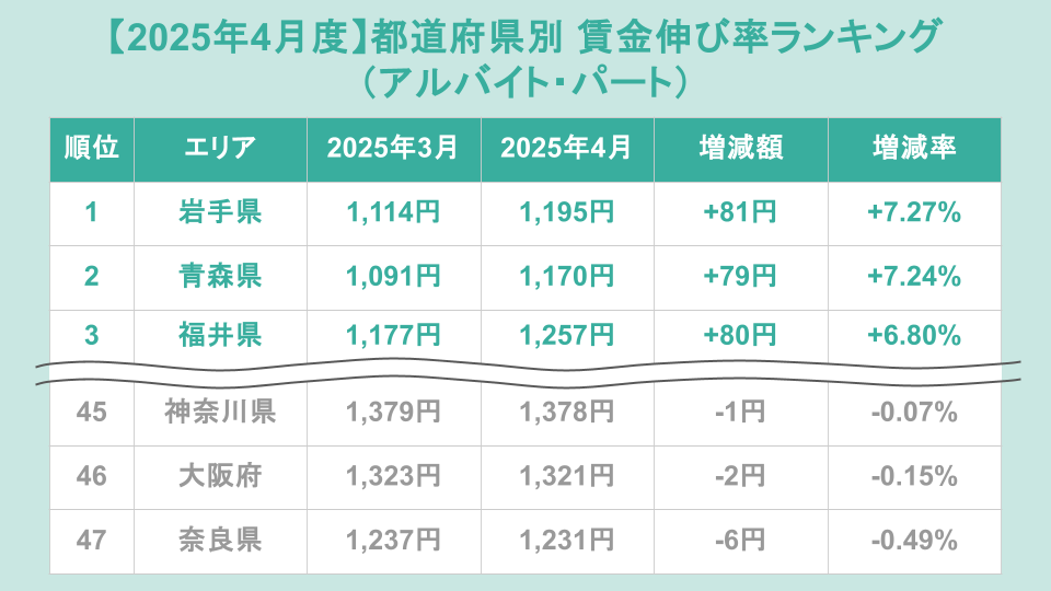 アルバイト・パートの都道府県別賃金伸び率ランキング(前月比)トップ3は、1位が岩手県(増加額+81円、増加率+7.27%)、2位が青森県(増加額+79円、増加率+7.24%)、3位が福井県(増加額+80円、増加率+6.80%)でした。