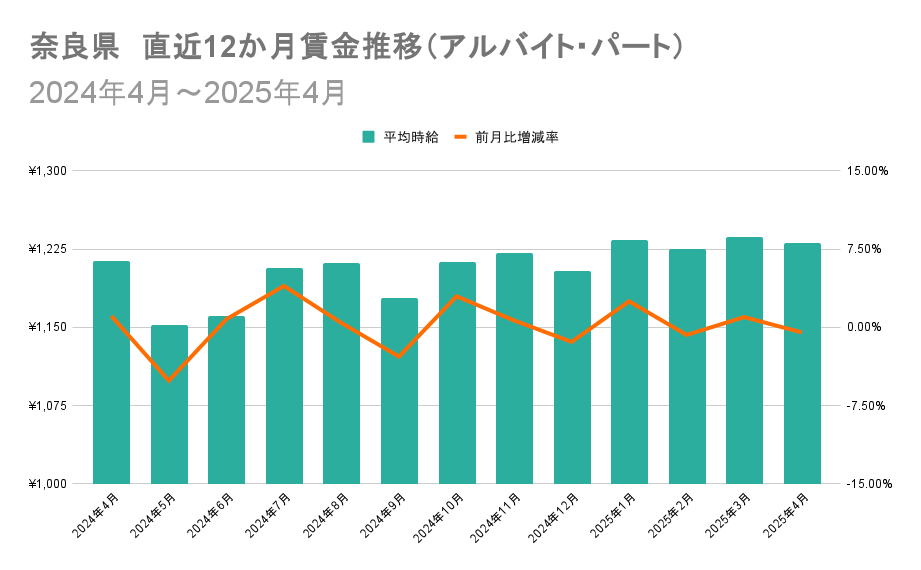 奈良県では、2024年7月から平均時給は横ばいで推移しています。