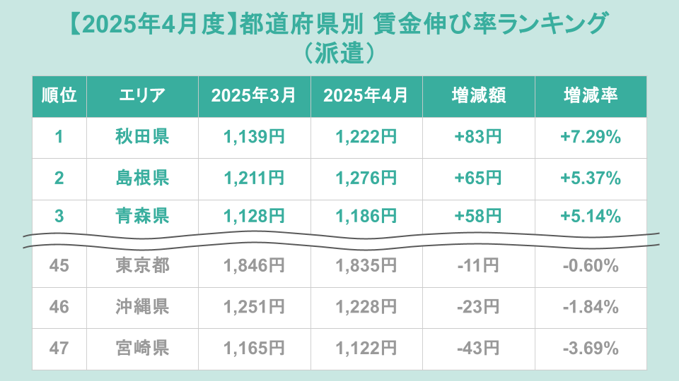 派遣の都道府県別賃金伸び率ランキング(前月比)トップ3は、1位が秋田県(増加額+83円、増加率+7.29%)、2位が島根県(増加額+65円、増加率+5.37%)、3位が青森県(増加額+58円、増加率+5.14%)でした。