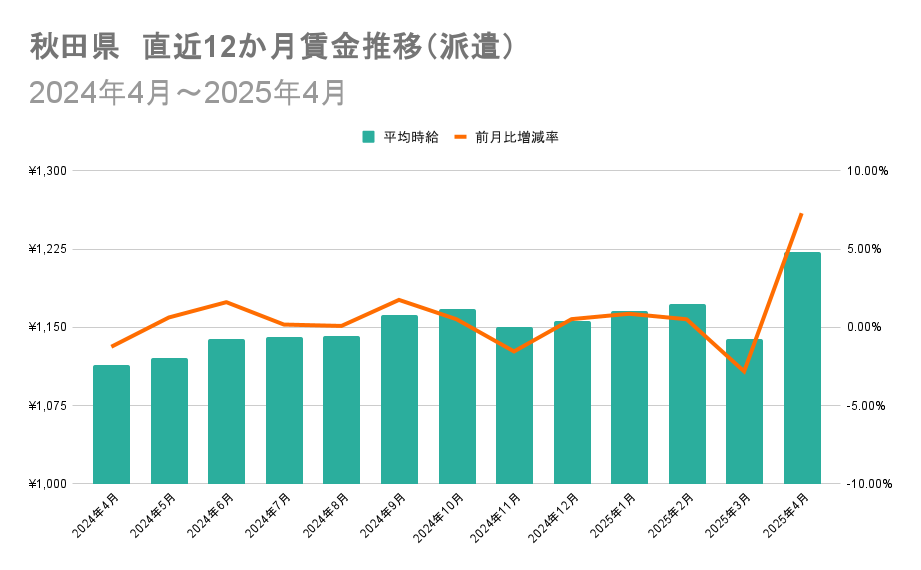 1位の秋田県と47位の宮崎県における直近12か月の賃金推移を比較すると、秋田県は2025年3月から同年4月にかけて、複数の派遣企業が時給1,200円を上回る高時給求人を複数出稿した影響で、平均時給が大きく上昇しました。