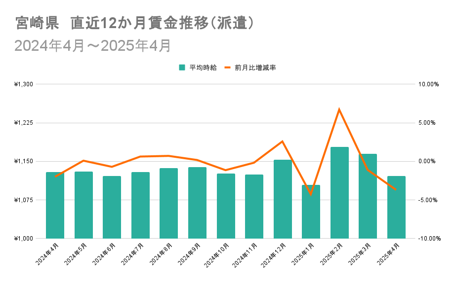 宮崎県では、2025年1月から同年2月にかけて特定企業が複数出稿していた時給1,000円の求人が掲載終了になったことが影響し、平均時給が大幅に上昇。2025年3月から同年4月にかけて、特定の派遣会社が時給1,000円の医療・介護系求人を複数出稿した影響で平均時給が減少しました。