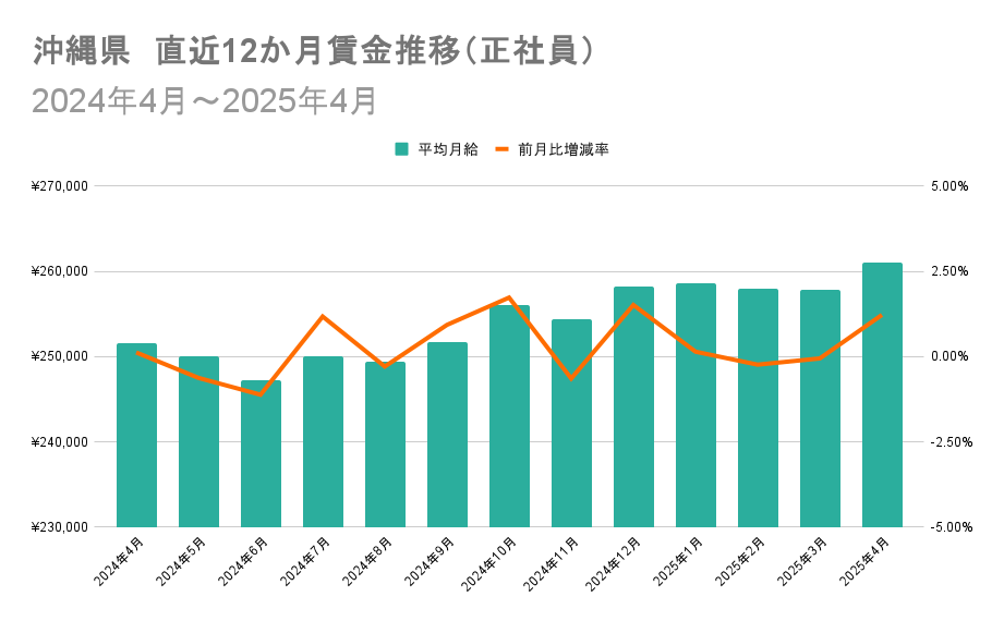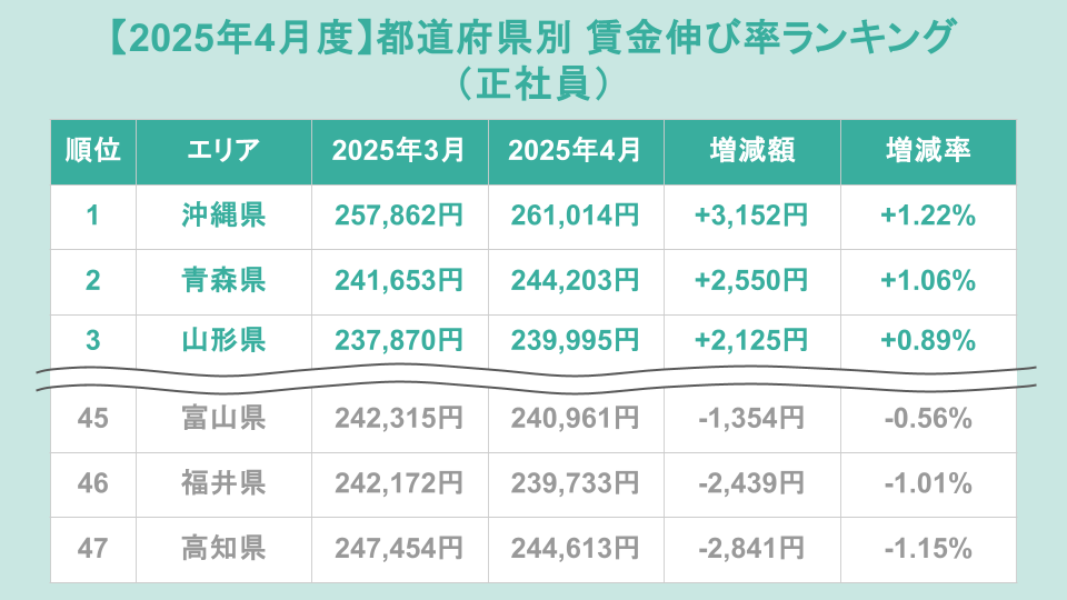 正社員の都道府県別賃金伸び率ランキング(前月比)トップ3は、1位が沖縄県(増加額+3,152円、増加率+1.22%)、2位が青森県(増加額+2,550円、増加率+1.06%)、3位が山形県(増加額+2,125円、増加率+0.89%)でした。
