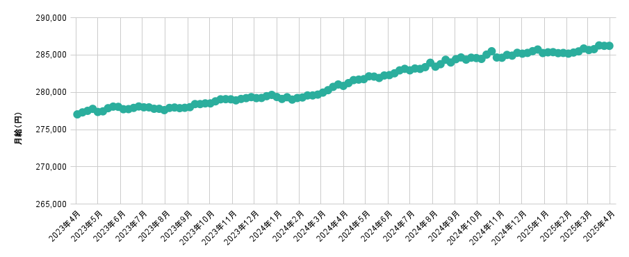 ■4月度の全国正社員平均月給は、286,385円(前月比+718円、前年同月比+5,525円)で前月から0.25%増加、前年同月から1.97%増加した。【図1】