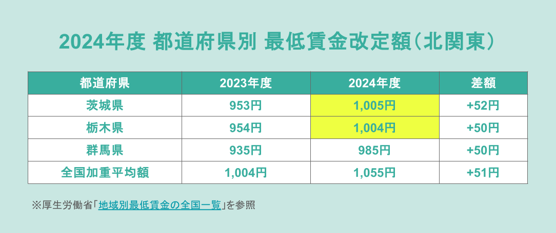 北関東エリアでの最低賃金引き上げ額を都道府県別に見てみると、それぞれ50~52円の引き上げ幅となっています。茨城県と栃木県の2県では、2024年度の最低賃金改定により、最低賃金が1,000円を超えました。