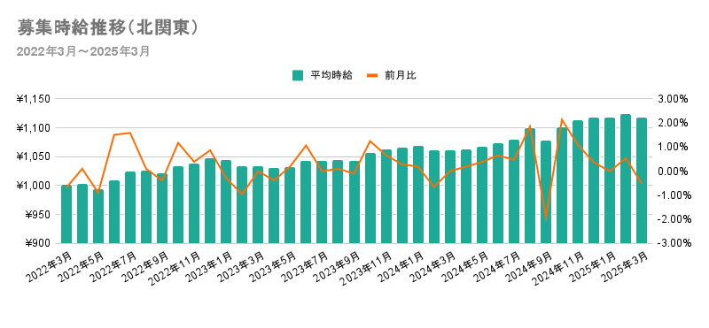 北関東エリアにおける、2022年3月から2025年3月まで3年間の募集時給を分析します。