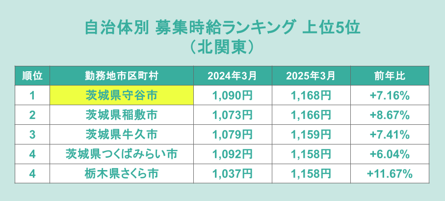 まずは、2025年3月の募集時給額をランキングで見てみると、茨城県守谷市が1,168円で1位となりました。次いで茨城県稲敷市が1,166円、茨城県牛久市が1,159円、茨城県つくばみらい市と栃木県さくら市が1,158円と続いています。上位5位中4つの自治体が、茨城県からのランクインとなりました。
