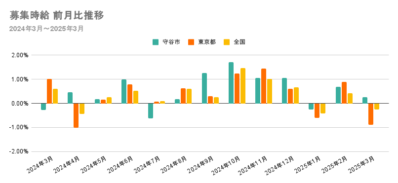 続いて、守谷市・東京都・全国の平均募集時給を、それぞれ前月比の推移で比較します。最低賃金が引き上げられた2024年10月に着目してみると、守谷市の募集時給は前月比+1.70%上昇し、東京都や全国の上昇率を上回りました。
