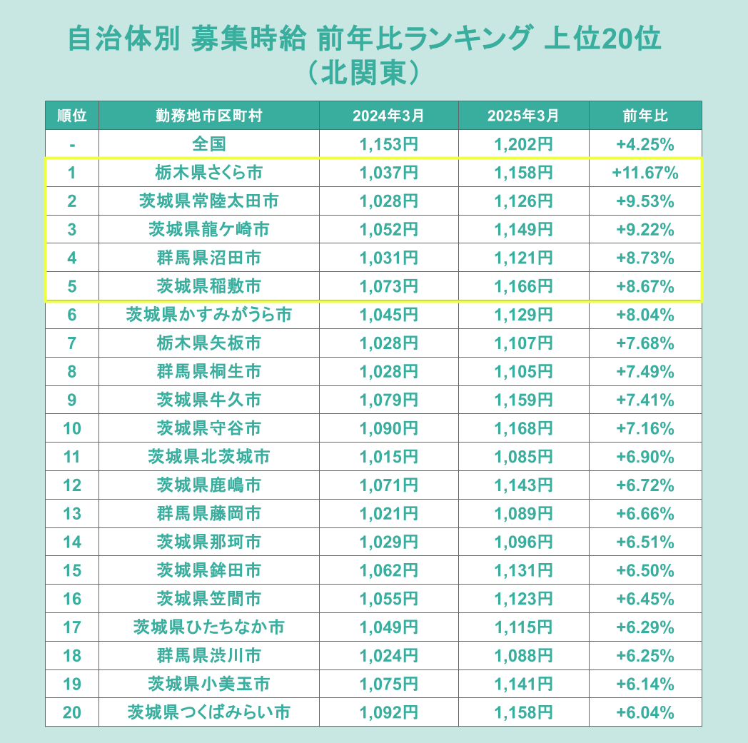 さらに、2025年3月時点の募集時給を前年比のランキングで分析し、時給上昇率に勢いのある北関東エリアの自治体を調査しました。