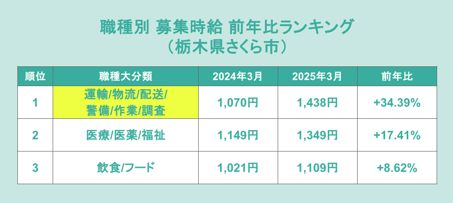 最後にさくら市の2024年3月から2025年3月にかけた募集時給上昇率を職種別に見てみると、「運輸/物流/配送/警備/作業/調査」が+34.49%で1位となりました。続いて「医療/医薬/福祉」が+17.41%、「飲食/フード」が+8.62%となっています。