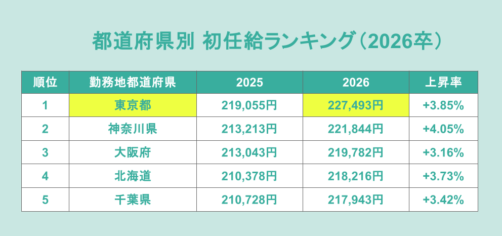 最後に、26卒における初任給を都道府県別のランキングで分析したところ、「東京都」が227,493円で1位となりました。次に「神奈川県」が221,844円、「大阪府」が219,782円、「北海道」が218,216円、「千葉県」が217,943円と続いています。25卒では千葉県が4位、北海道が5位となっていましたが、26卒では逆転していました。