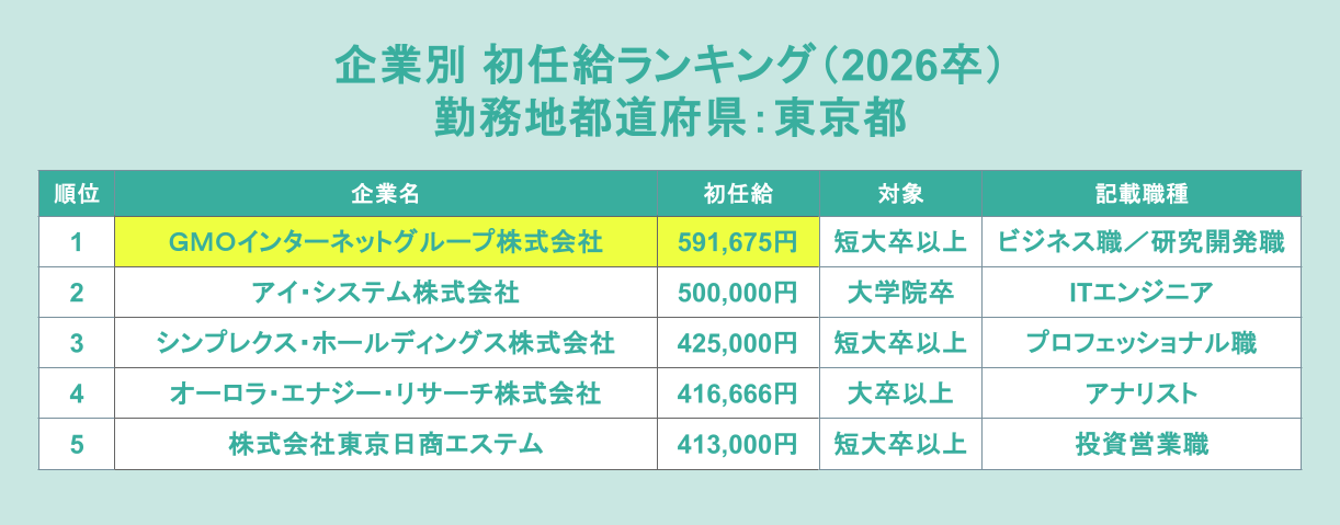1位の東京都における26卒の初任給を企業別に調査してみると、「GMOインターネットグループ株式会社」が591,675円で最高額となっています。次いで「アイ・システム株式会社」が500,000円、「シンプレクス・ホールディングス株式会社」が425,000円、「オーロラ・エナジー・リサーチ株式会社」が416,666円、「株式会社東京日商エステム」が413,000円と続きました。