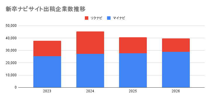 まずは、23卒のナビサイトから26卒までのナビサイトで、出稿企業数の推移を調査しました。24卒での増加を除くと、4万社前後でほぼ横ばいとなっています。ダイレクトリクルーティングなど他の採用手法が広まっていることも、企業数の増加が少ない要因の1つと言えそうです。