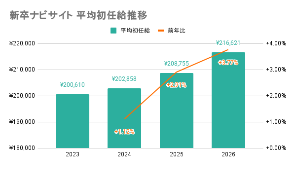 続いて新卒ナビサイトでの平均初任給を見てみると、前年比の伸び率が毎年上がっており、各社で初任給を引き上げている様子がうかがえます。26卒の平均初任給は、25卒から3.77%(7,866円)増加して216,621円となり、21万円台に突入しました。