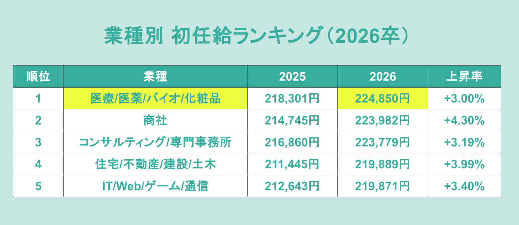 続いて、26卒における初任給を業種別のランキングで分析したところ、「医療/医薬/バイオ/化粧品」が224,850円で1位となりました。次に「商社」が223,982円、「コンサルティング/専門事務所」が223,779円、「住宅/不動産/建設/土木」が219,889円、「IT/Web/ゲーム/通信」が219,871円と続いています。