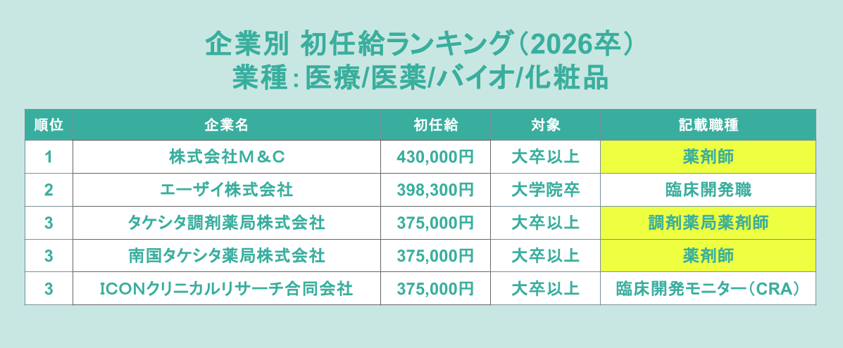 1位の医療系業種における26卒の初任給を企業別に調査してみると、「株式会社M&C」が430,000円で最高額となっています。次いで「エーザイ株式会社」が398,300円、「タケシタ調剤薬局株式会社」と「南国タケシタ薬局株式会社」と「ICONクリニカルリサーチ合同会社」が375,000円と続きました。それぞれの記載職種を見てみると、5社中3社が薬剤師の募集となっています。