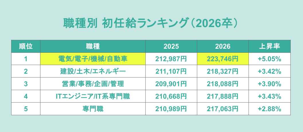 さらに、26卒における初任給を職種別のランキングで分析したところ、「電気/電子/機械/自動車」が223,746円で1位となりました。次に「建設/土木/エネルギー」が218,327円、「営業/事務/企画/管理」が218,088円、「ITエンジニア/IT系専門職」が217,888円、「専門職」が217,063円と続いています。