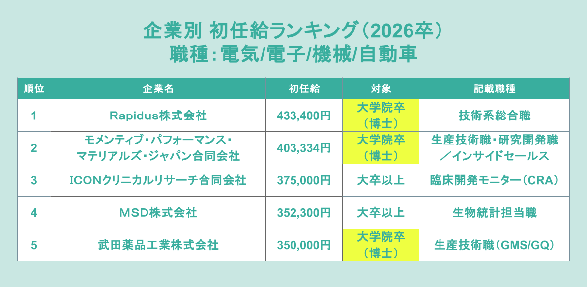 1位の電気・機械系職種における26卒の初任給を企業別に調査してみると、「Rapidus株式会社」が433,400円で最高額となっています。次いで「モメンティブ・パフォーマンス・マテリアルズ・ジャパン合同会社」が403,334円、「ICONクリニカルリサーチ合同会社」が375,000円、「MSD株式会社」が352,300円、「武田薬品工業株式会社」が350,000円と続きました。それぞれの対象学歴を見てみると、5社中3社が博士課程修了予定の学生に向けた給与水準となっています。