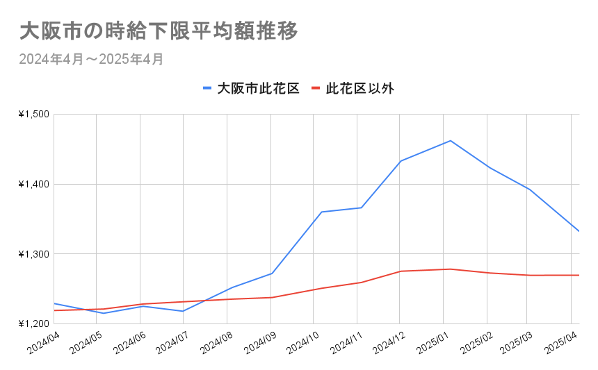 まずは万博会場が位置する大阪市此花区と、此花区を含む大阪市全体の直近1年間における平均時給推移を見てみます。2024年4月の平均時給は、大阪市此花区で1,229円、大阪市平均で1,219円でした。此花区では2025年1月にかけて平均時給が1,462円(増加額+233円、増加率+18.96%)まで急上昇し、大阪市平均の1,286円(増加額+67円、増加率+5.49%)と比較しても顕著な伸びを記録しました。
