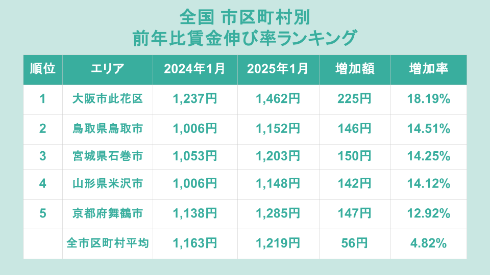 さらに、2025年1月のピーク時と前年同月を比較すると、大阪此花区では増加額+225円、増加率+18.19%となりました。この伸び率は全国の市区町村別ランキングで1位であり、2位の鳥取市に3.68ポイント差、全市区町村平均に対しては13.37ポイントと大きな差をつけました(外れ値調整のため、求人数100件以上の市区町村を対象に集計)。
