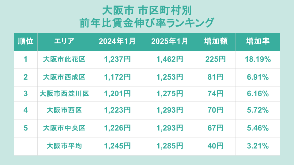 大阪市内の上位5エリアを見ると、此花区を除き平均時給の増加率は5〜7%程度にとどまりました。此花区を含む大阪市全体でも+3.21%と、全国市区町村平均の+4.82%を下回る結果に。時給上昇は、万博会場を抱える此花区に集中的に発生していることが浮き彫りとなりました。