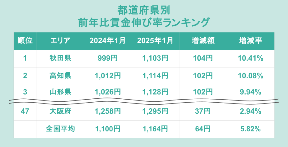 都道府県別で見ると、大阪府の平均時給増加率は+2.94%にとどまり、47都道府県中最下位という結果になりました。大都市圏としてもともと給与水準が高く、伸び率が抑制されやすい傾向はあるものの、大阪府全体では万博開催による目立った影響は見られませんでした。