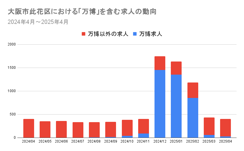 「万博」をキーワードに含む求人数は、2024年12月をピークに減少傾向を示し、直近の2025年4月時点では27件と大幅に縮小しています。これは、万博開幕前の準備期間に必要な人員を確保し終えたことで、募集が一時的にクローズされた結果だと考えられます。