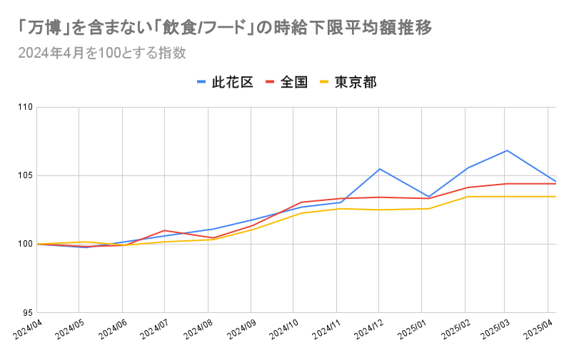 最後に、大阪市此花区における万博関連ではない求人の動向も見てみます。特に「飲食/フード」では、「万博」をキーワードに含んでいない求人においても平均時給が上昇していました。2024年4月を100とする指数で直近1年間の推移を見てみると、2024年12月、2025年2月、同年3月には全国平均を2~3ポイント、東京平均を3~4ポイント上回って賃金が増加しています。万博開催に伴う周辺需要の拡大や人手不足が、万博関連求人以外にも波及し、賃金を押し上げたと考えられます。