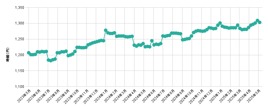 ■5月度の全国アルバイト・パート平均時給は、1,303円(前月比+9円、前年同月比+77円)で前月から0.70%増加、前年同月から6.28%増加した。【図1】