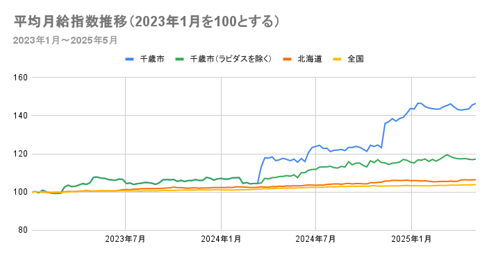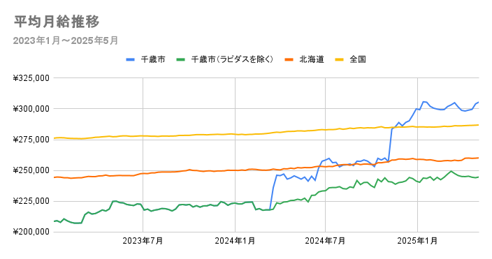 ラピダスを除外した千歳市の平均月給は現在も一番低い水準となっていることから、ラピダスが千歳市全体の平均月給を引き上げている様子がうかがえました。