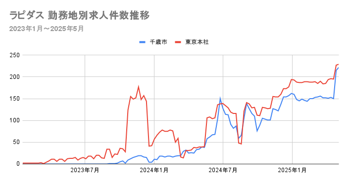 続いてラピダスの求人を千歳市と東京都千代田区(以下、東京本社)の勤務地別に調査します。千歳市では、千歳工場の建設が始まった2023年9月から求人の出稿も開始されました。2025年4月には試作ラインの稼働が始まり、2025年5月時点の求人件数は東京本社と同水準となっています。