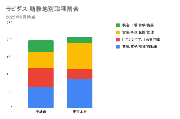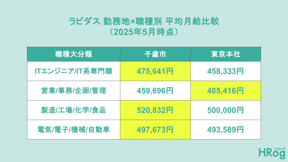 続いて、2025年5月時点におけるラピダスの平均月給を勤務地別および職種別の分析で見てみると、営業・事務以外では東京本社より千歳市の方が高いことが分かりました。