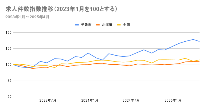 まずは千歳市・北海道・全国の求人件数を、2023年1月の件数を100とした指数で比較します。千歳市の求人件数は北海道・全国と比べて増加率が高く、2025年4月時点では2023年1月と比較して約1.4倍の求人件数となりました。