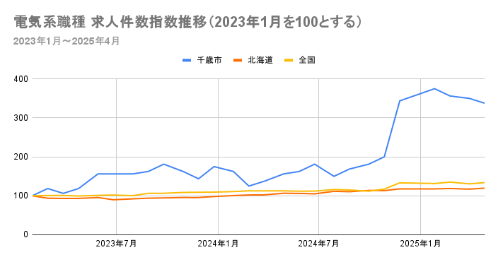 同じく千歳市・北海道・全国の求人件数を、電気系職種に絞った指数で分析したところ、千歳市での伸び率は全職種での伸び率を大きく上回っています。千歳市における2025年5月時点の求人件数は2023年1月と比較して約3.4倍となっており、ラピダスの拠点進出が特に電気系職種の求人件数増加に影響していることが分かりました。