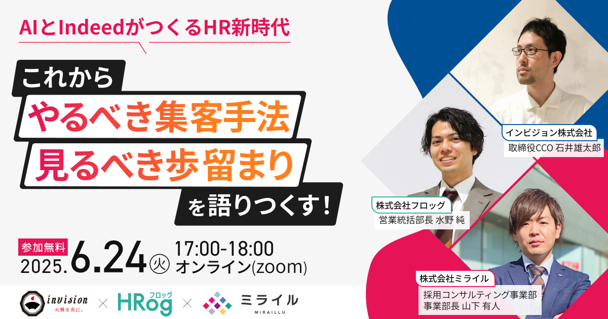 分析用求人ビッグデータを提供する株式会社フロッグ(所在地:東京都千代田区、代表取締役:阪野 香子、以下「当社」)は、2025年6月24日(火)にオンラインセミナー「AIとIndeedがつくるHR新時代!これからやるべき集客手法、見るべき歩留まりを語りつくす」を開催いたします。