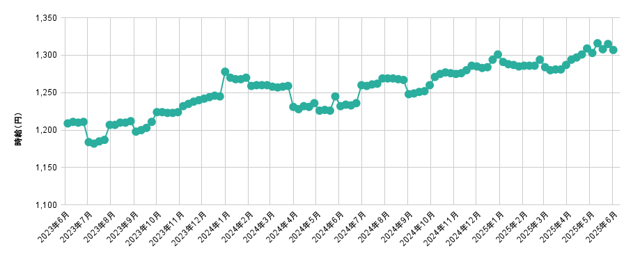 ■6月度の全国アルバイト・パート平均時給は、1,307円(前月比+4円、前年同月比+75円)で前月から0.31%増加、前年同月から6.09%増加した。【図1】