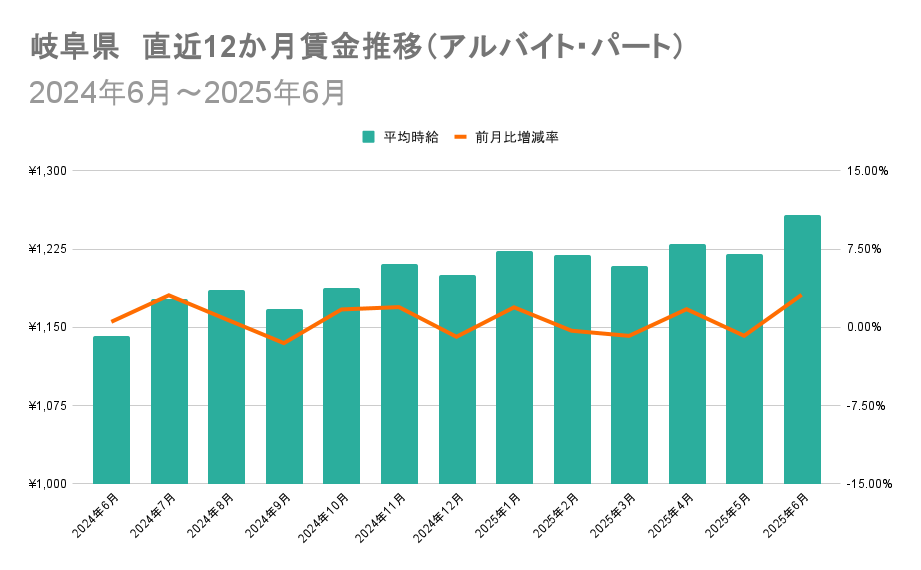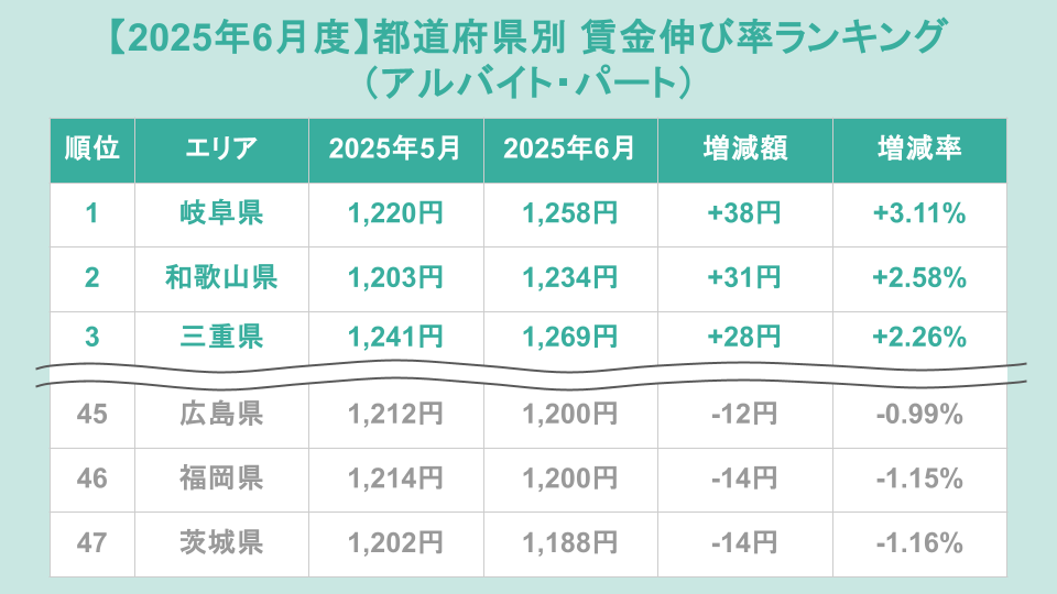アルバイト・パートの都道府県別賃金伸び率ランキング(前月比)トップ3は、1位が岐阜県(増加額+38円、増加率+3.11%)、2位が和歌山県(増加額+31円、増加率+2.58%)、3位が三重県(増加額+28円、増加率+2.26%)でした。
